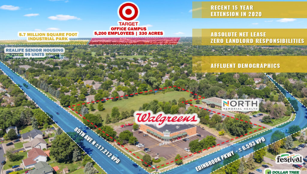 The Property has exceptionally high reported sales volumes and in 2020 Walgreens extended the lease to a firm 15 years before the next option period showing commitment to the location. The Property is located in Brooklyn Park, an affluent neighborhood 10 minutes north of Minneapolis, with median household incomes of $96,000 in a 1-mile radius and within a 5-mile radius of the Property there are over 250,000 residents.