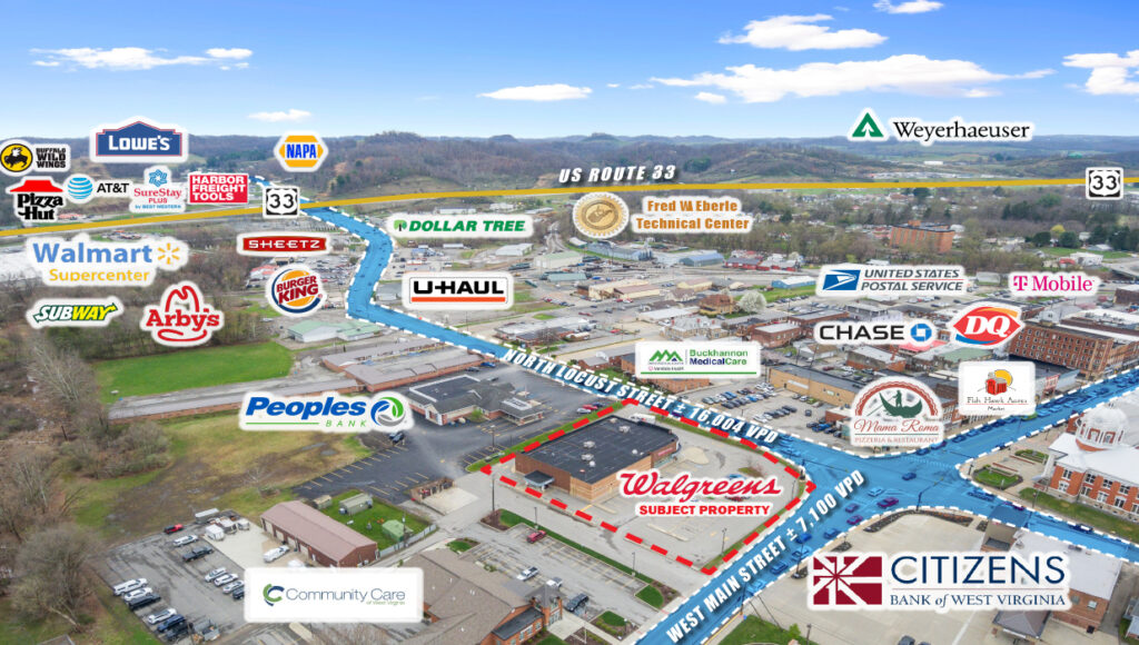 The Property is uniquely positioned as the only Walgreens in Buckhannon, with the next nearest location over 15 miles away, making it a critical provider of pharmacy services to the surrounding community. Strategically located less than half a mile from St. Joseph's Hospital, the area's only Level IV trauma center, the Property benefits from a healthy customer base driven by 24/7 emergency and healthcare services.