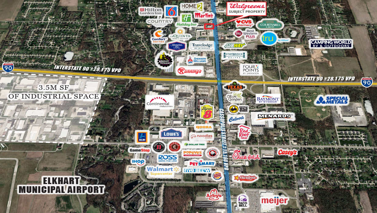 - Located along Elkhart’s main commercial corridor with 24,246 vehicles per day, surrounded by national retailers including Walmart, Meijer, Lowe’s and Menards.