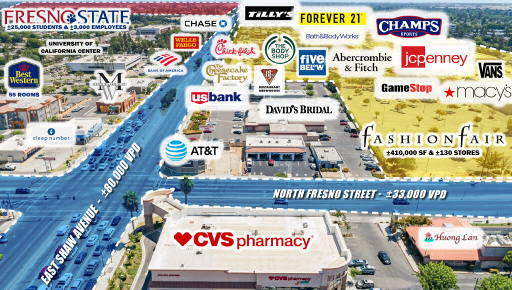 The Asset is located directly across from the 410,500 square foot Fashion Fair Mall anchored by Macy’s and JC Penny’s. This is a highly trafficked intersection in the main retail corridor of Fresno with a combined traffic count of over 113,000 vehicles per day. There is approximately 31 million square feet of retail space within a 5-mile radius. Located just three miles northeast of the Asset is St. Agnes Medical Center medical Center, a 384 full service hospital with approximately 2,000 medical and support staff.