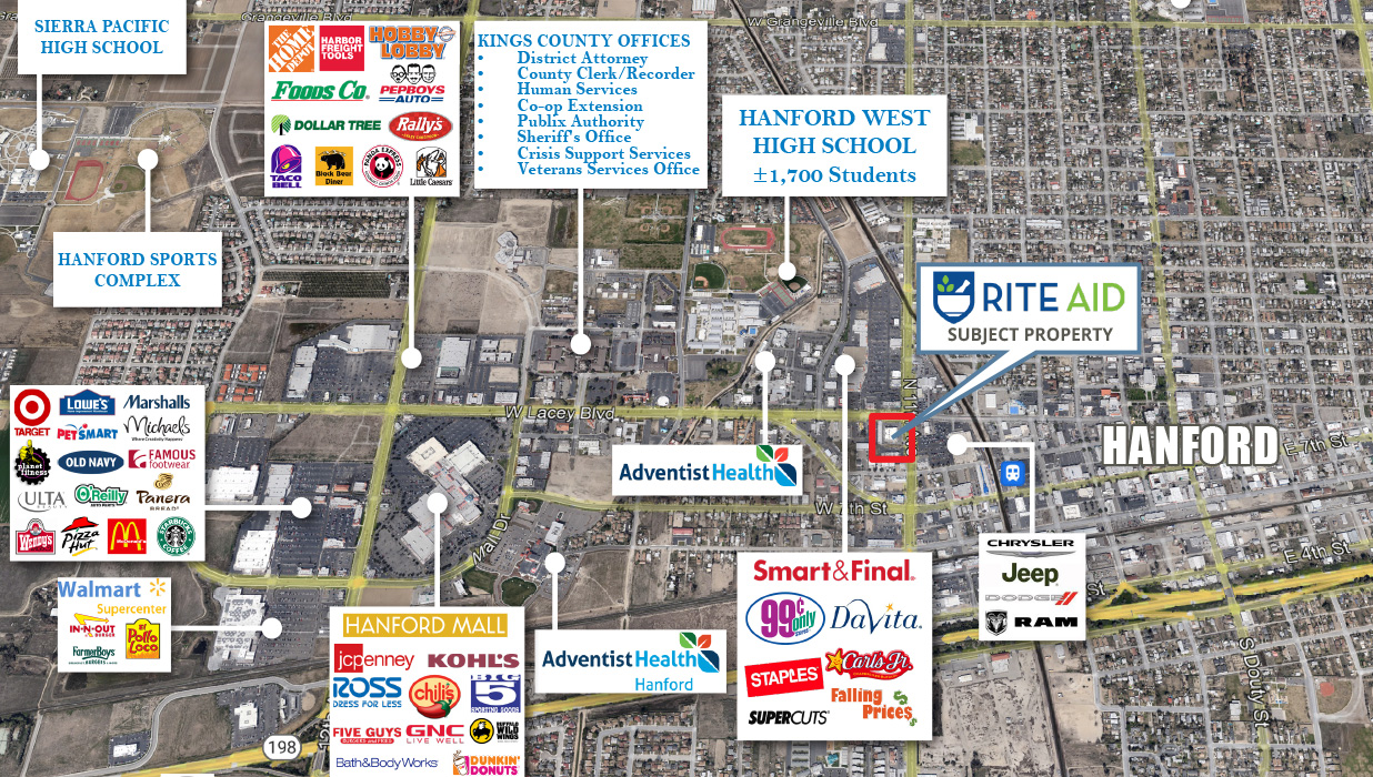 The Property is located in the heart of Hanford at one of the busiest intersections in the city with traffic counts of nearly 40,000 vehicles per day. Across the street is Hanford Towne Center (±222,000 SF) anchored by Smart & Final, Staples, and 99 Cents Only. Within a mile is the Hanford Mall (±464,000 SF) with national anchors such as Kohls, JCPenny's, Ross Dress for Less and Big 5 Sporting Goods. Also in the vicinity is The Marketplace at Hanford (318,000 SF), which is home to Target, Lowe's, PetSmart, Old Navy, Marshalls, Starbucks and O'Reilly Auto Parts.