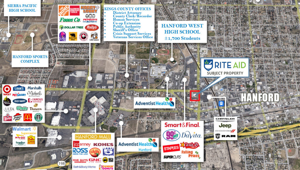 The Property also benefits from a strong medical presence and one mile to the west is the Adventist Health Hanford, a 142-bed acute care hospital which employs approximately 4,000 medical and administrative staff including satellite medical offices just two blocks away from subject property.