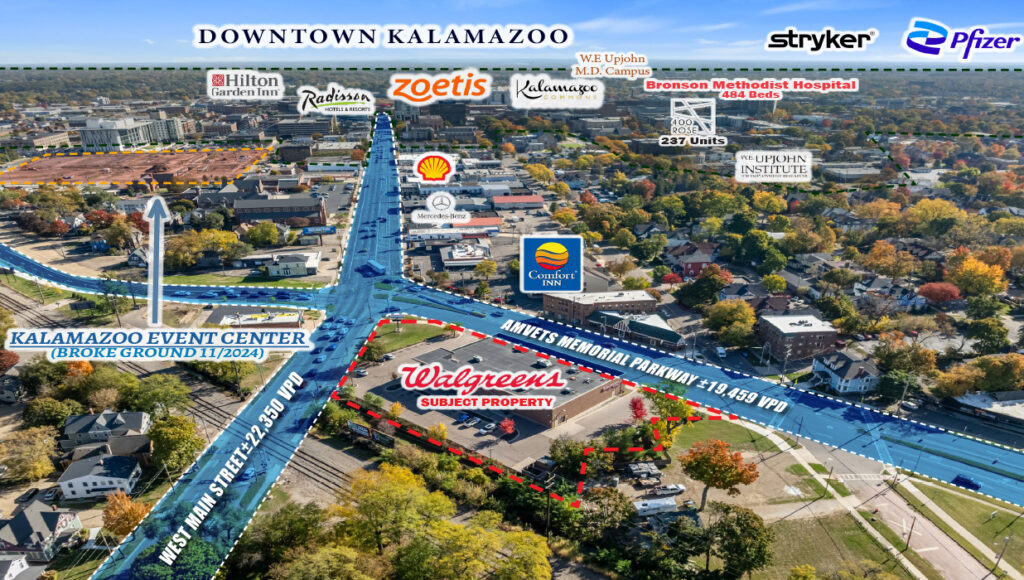 The Property is located at the intersection of Michigan Avenue and Main Street, off two major thoroughfares with ±42,000 vehicles passing daily. This high-traffic area provides direct access to Western Michigan University, which serves approximately ±22,500 students, and major employers such as Pfizer, a global pharmaceutical leader, Stryker, a Fortune 500 medical technology company, and Zoetis, the world’s largest producer of medicine and vaccinations for pets and livestock.