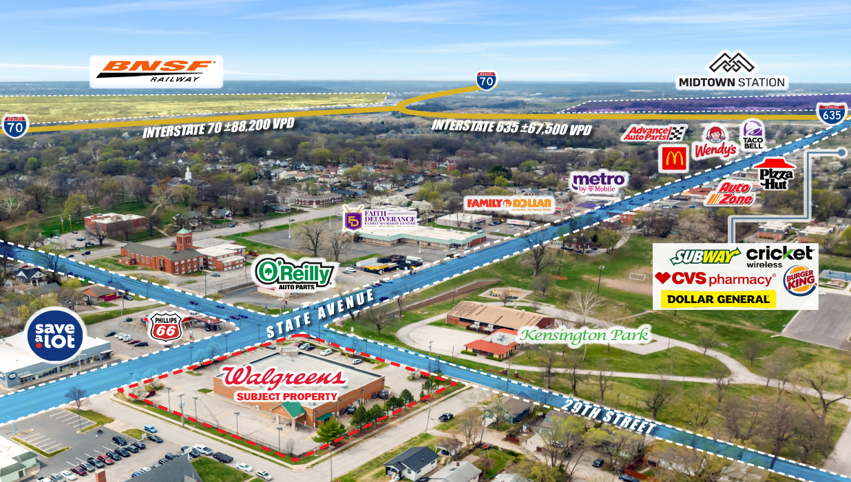 As the only freestanding Walgreens within a 5-mile radius, the Property serves 140,000+ residents in the Kansas City MSA (2.2M total population), ensuring consistent demand and long-term stability. Additionally, the Property is situated within the State Avenue Corridor Redevelopment Project and located 1 mile east of Midtown Station, a major mixed-use redevelopment featuring 1,500 new residences, 200,000 SF of commercial space, a hotel, and an innovation hub.