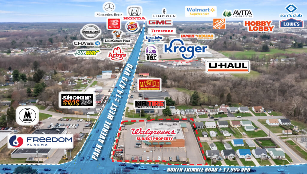 The Property is located along the corner of Park Avenue West and Trimble Road, a commercial corridor with a combined average daily traffic count of approximately 32,474 vehicles. It is adjacent to Mansfield Senior High School and near residential neighborhoods and municipal buildings. There are no other Walgreens or CVS stores within a 32-mile radius, with the nearest direct competitor being a Rite Aid nearby. The site is located near downtown Mansfield, where the city is implementing a streetscape and infrastructure revitalization plan focused on improving traffic flow and accessibility in the central business district.
