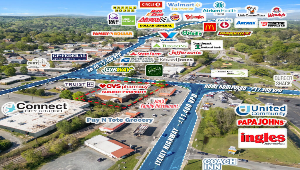 Pharma Property Group is pleased to market for sale the CVS property located at 9849 Rome Boulevard Summerville, Georgia 30747 (“The Property”). Summerville is located in the foothills of northwest Georgia and is the county seat of Chattooga County, Georgia. The city is strategically positioned about an hour South of Chattanooga, Tennessee and two hours North of Atlanta, Georgia.