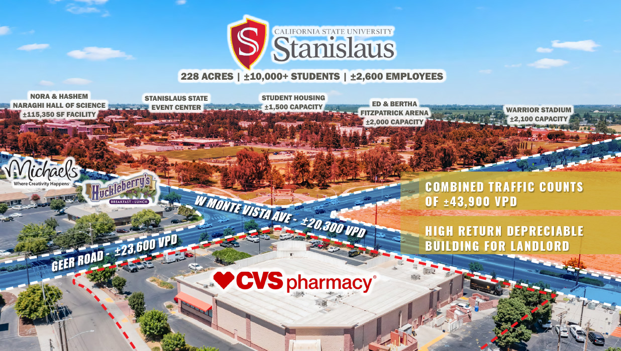 The Asset is located directly across from California State University Stanislaus' 228-acre campus which hosts approximately 10,000 students and employs about 2,600 staff. This is a highly trafficked intersection in the main retail corridor of Turlock with a combined traffic count of over 43,900 vehicles per day. There is approximately 5.6 million square feet of retail space within a 5-mile radius which includes four retail shopping centers within blocks of the Asset totaling ±468,216 square feet of retail space. Located just one mile southeast of the Asset is Emanuel medical Center, a 209 full service hospital with approximately 1,400 medical and support staff.